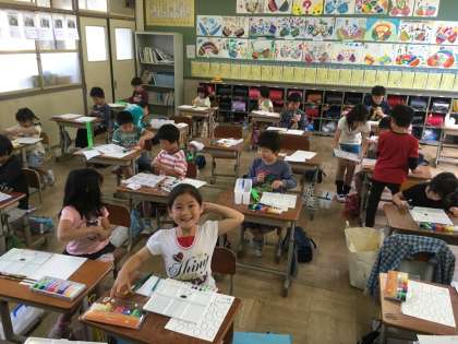 今日は授業で初めて絵の具を使いました。この授業が入る前まで子どもたちは「いつ絵の具を使うの?」と待ちにまっていたので今日は目がルンルンしていました。