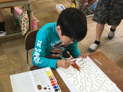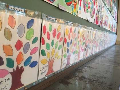 赤と青を混ぜて紫、青と黄色を混ぜて緑になることなどを知り、パレットの上で色を混ぜる学習もしました。色の変化を楽しみながら、できた色を塗っていました。最後に完成した絵は教室に飾りました。みんなの絵がそろうととっても鮮やかで綺麗でした。よく頑張りましたね。