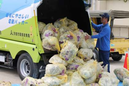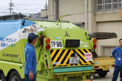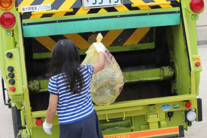 後半は,運動場に出てパッカ—車を間近で見せてもらったり,ゴミの収集体験をさせてもらったりしました。また,安全にゴミを回収する工夫や,もしもの時の緊急停止ボタンについても教えてもらい勉強になりました。