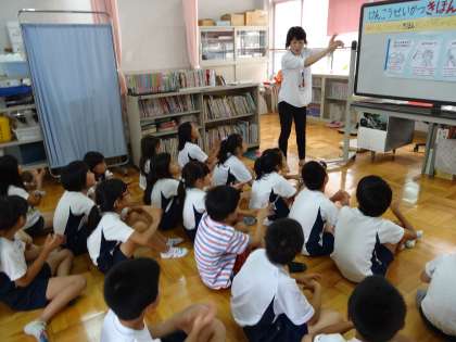 まず,佐々木先生から「どんぐりころころ」を歌っての手洗いの仕方の復習がありました。