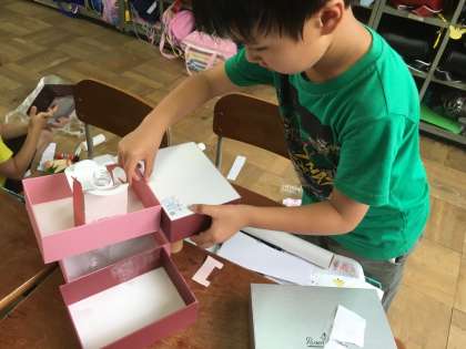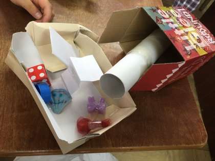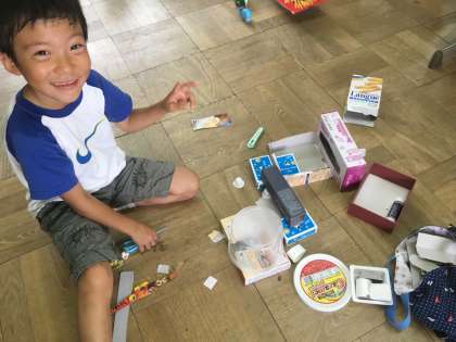 図工で、お友達を呼ぶためのお家を作りました。空き箱を重ねたり、カップをくっつけたりして玄関やテーブル、お風呂など細かく作っていきました。
