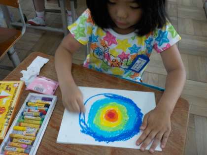 図工「ためしてみよう」では,パスで虹色に塗った後,黒で塗りつぶし,上から竹串で描くことで,下の色が浮き出てくるのを試して,楽しみました。黒く塗りつぶす時は,「えー,もったいない!」と声が飛び交っていましたが,下からきれいな色が出てくることに感動していました。