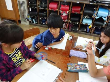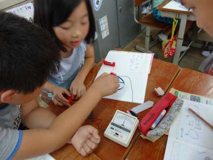乾電池の向きをかえると,モーターの回る向きが変わるのかを調べたり,簡易検流計をつないで電流の向きを確かめたりしました。
