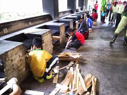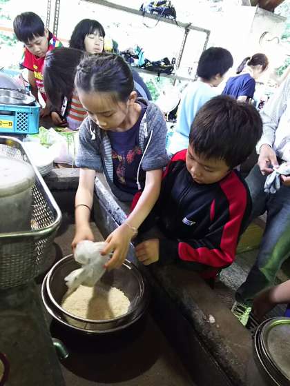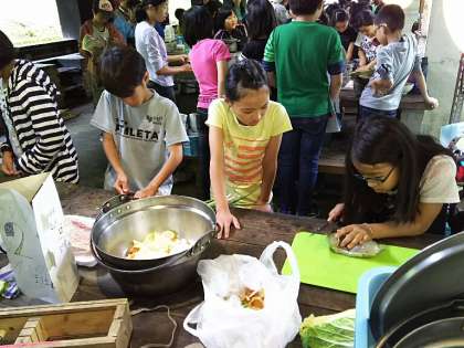 お米を研いだり、かまどを準備したり、野菜を切ったり、作っている横で一生懸命洗い物をしたりして、みんながんばっています。