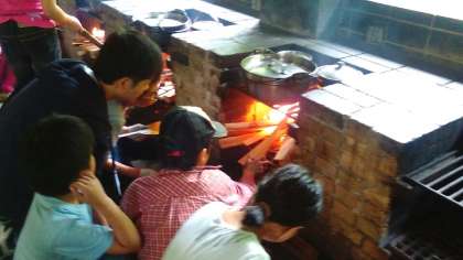 かまどをかこんで出来上がりを待っています。さあてどんな味に仕上がるでしょうか?