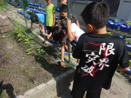 ヘチマとツルレイシは,これからネットに蔓を巻きつけて育っていくので,先生たちでネットをはりました☆