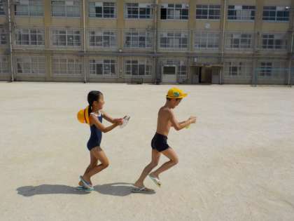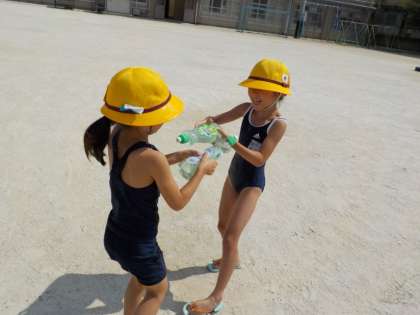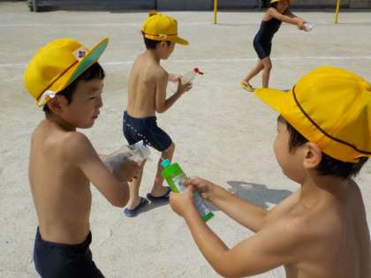 生活「なつをとびだせ」では,夏にしかできない遊びを思いっきりしよう!ということで,運動場で水あそびをしました。洗剤やマヨネーズの空き容器にたっぷり水を入れて,友達とかけ合っていました。水着に着替えてしたので,思いっきり水浸しになってキャーキャー言いながら遊んでいました。