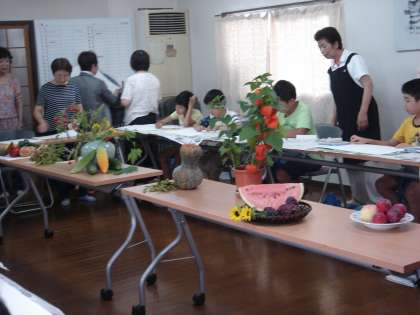 野菜(なす・きゅうり・かぼちゃ・ゴーヤ・パプリカ・しょうが・すいか)やフルーツ(桃・プラム・ぶどう),花,実,ほおずきなどの季節感あふれる植物をじっくりと見ながら絵を描いていきました。