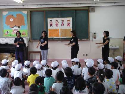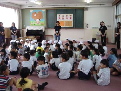 まず,ボランティアの方々による手遊び「いわしのひらき」で会場が盛り上がりました。ズンズンチャーチャ ズンズンチャ ズンズンチャーチャ ズンズンチャ いわしの開きがしおふいてパッ。ズンズンチャーチャ ズンズンチャ・・・ 。ニシン・サンマ・シャケとくりかえしが続き,最後はくじらがしおふいてドカーン。みんな大喜びで手遊びに興じていました。