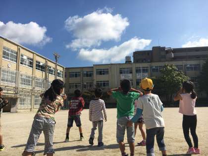 手をつないで「天までとどけ,一,二,三。」の合図とともにジャンプすると,雲に乗りたいという気持ちでいっぱいになりました。