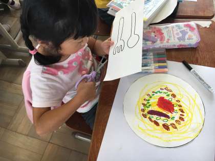 スプーンとフォークもつけて,「いただきまーす」。お皿とスプーンの丸みを再現している子どももいましたよ。