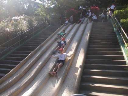 あんまり大きいので最初は嫌がったり恐々とすべったりしていましたが、慣れるといろんなかっこうですべったり、「せーの!」で一緒にすべったり楽しんでいました。