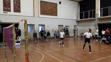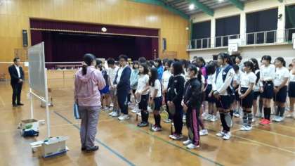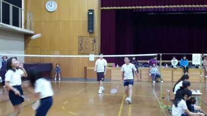 体育館では,羽束師小学校・深草小学校・明親小学校のみなさんをお迎えし,バドミントン交流会が行われています。
