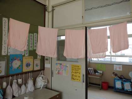 ○空気が乾燥すると、かぜやインフルエンザが広がりやすいため、「湿気タオル」を教室内にかけています。