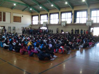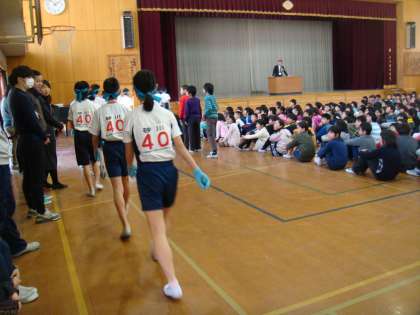 2月12日(日)の大文字駅伝大会で,第4位に輝いた砂川小学校。栄冠を勝ち取ったチーム6年の健闘を讃える集会を行いました。