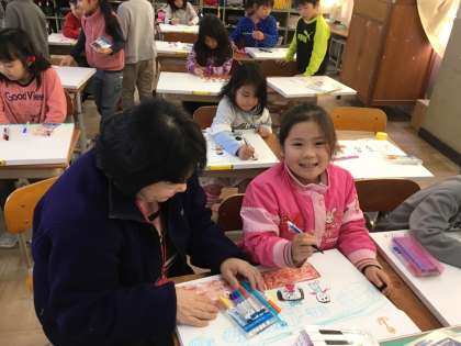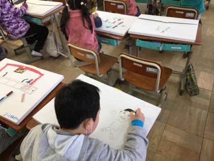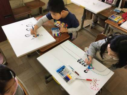 一年間の作品を入れる作品バッグに絵を描きました。テーマは「2年生の思い出」です。子どもたちは、運動会のデカパン競争の絵や学芸会の宇宙旅行記など心に残ったことを思い思いに描いていました。作品バッグを作っていると、2年生も残りわずかだなとしみじみと感じます。残り10日、あきらめずに最後まで、まだまだChallengeできることを探して頑張ってほしいと思います。