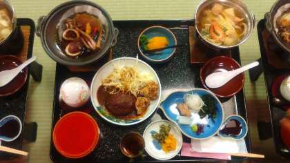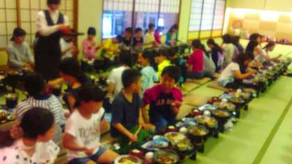 晩ごはんです。ごうせいなメニューに大喜びの子どもたち。おいしくいただきま〜す。