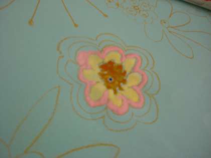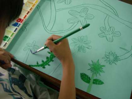 今まで学習した水彩絵の具の使い方をおさらいした後,ていねいに彩色している様子です。みんな集中して取り組んでいます。いろとりどりの美しいまぼろしの花が出来上がっていきそうです。