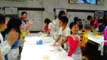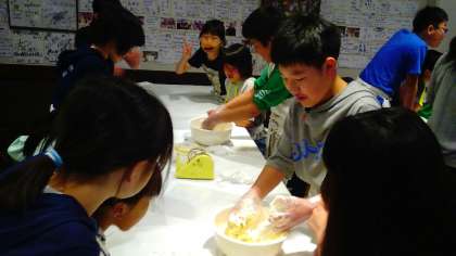 みんなで生地づくり。混ぜてこねています。