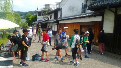 子どもたちは、のどかで静かな美観地区を歩きながらおみやげ選びを楽しんでいます。