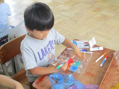 ぺットボトルや,たまごパック,プリンカップにペンで色を塗ったり,色セロハンを切って貼ったりしました。光を通して形や色の変化を楽しみました。