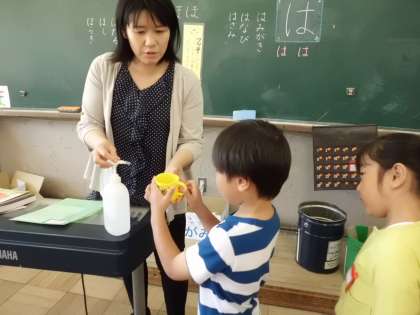 担任の先生に一人ずつコップにフッ素を入れてもらうときも「お願いします」「ありがとうございました」と,マナーよくできていました。