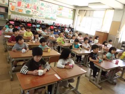 1年生は本番までに,水を使ってフッ化物洗口の練習を何度もしてきました。
