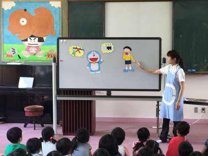 今日は、はみがき指導がありました。歯科衛生士さんにはみがきをしないとどうして虫歯になるのかをドラえもんのペープサートを使ってお話ししてくださいました。子どもたちは、お話を夢中になって聞いていて、はみがきの大切さをしっかりと理解しているようでした。