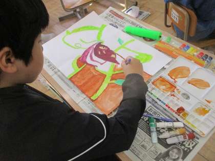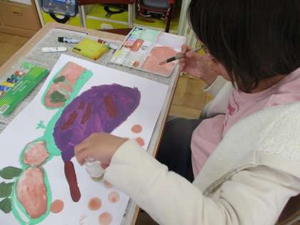 さつまいものえを えのぐでいろをぬりはじめました。