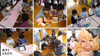 秋見つけで集めた秋の素材を使って、おもちゃ作りをしました。どんぐりや落ち葉、木の実などを使って、こま、けん玉、マラカス、クリスマスツリーなど、子どもたちのアイデアはどんどん広がっていきました。