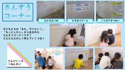 これまでの「かたちづくりコーナー」に代わり、今日から新しい「算数コーナー」がスタートしました。