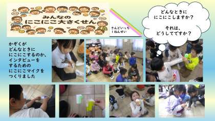 マイクが完成したあとは「どんな時ににこにこしますか?」「どうしてですか?」と全員でインタビューの練習をしました。お家でしっかりインタビューできていたでしょうか。