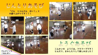 ようぐあそびでは、いろいろな用具を使って遊びます。今回の用具はフラフープです。腕や腰を使って回したり、ジャンプしたりと工夫しながら楽しく活動しました。