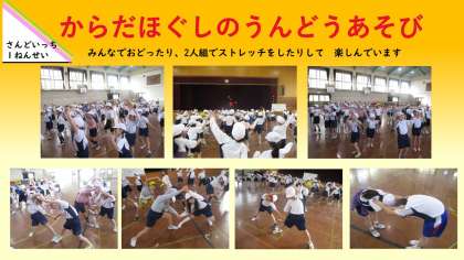 その後は、2人組になってストレッチに取り組みました。腕や背中、足など、体のいろいろな部分をゆっくり伸ばしながらほぐしていきます。友だちと声をかけあいながら活動することで、体がほぐれるだけではなく、心も自然とほぐれていく時間となりました。
