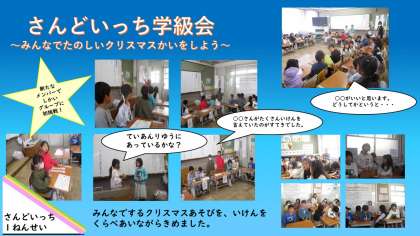 決める場面では、提案理由に合っているかどうかをしっかり考え、みんなで話し合って決めることができました。クリスマス会でする「みんな遊び」が決まり、当日が今から楽しみです。