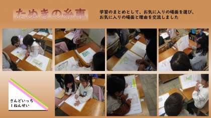 国語の学習で「たぬきの糸車」を学習しました。学習のまとめとして、お気に入りの場面とその理由をカードに書き、友だちと交流しました。お気に入りの場面が違う友だちがいたり、同じ場面を選んでいても理由が一人一人違ったりすることに気付きました。交流を通して「そこがおもしろいとおもったんだ「わたしもすき」など友だちの考えを知ることができ、考えの違いのおもしろさを感じたさんどいっち1年生でした。