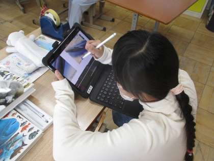 ほんやずかんや タブレットでしらべながら もんだいをかんがえています。