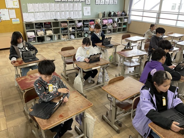 外国語の学習で、他校の4年生と「学校で自分のお気に入りの場所」についてオンラインで交流しました。