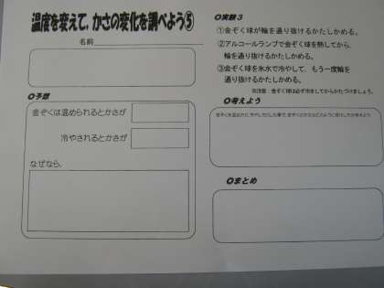 「空気」「水」「金属」が温度を帰ることでかさがどのように変わるのかを,実験を通して学習しています。