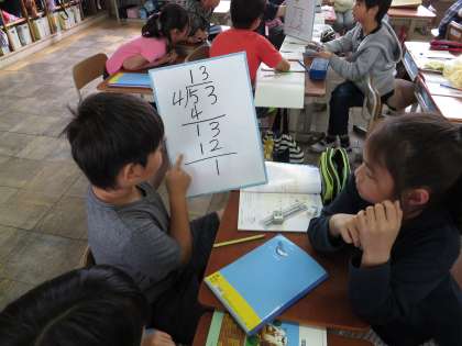算数の学習で,「1けたでわるわり算の筆算」について学習しています。筆算の仕方として,1.たてる 2.かける 3.ひく 4.おろす のルールをしっかりと守り,筆算の計算に臨んでいます!授業では,友だちに筆算の仕方を説明し合い,筆算の仕方が定着できるようにしています!