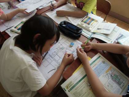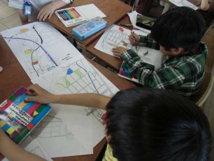 校区探検で調べたことをグループごとに絵地図にまとめました。色を変えたり,絵をかいたり,それぞれが工夫してまとめました。