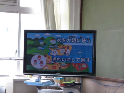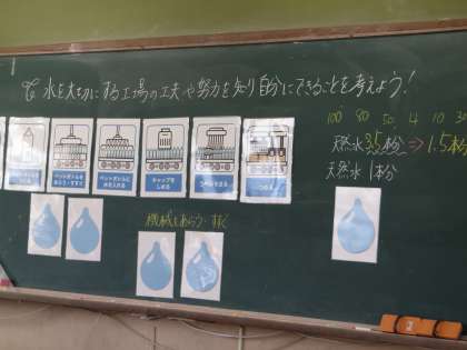 今すぐ使える水は,地球上の0.01%しかないことや販売している水500mlを作るのにおよそ1750mlもの水が使われていることを学習し,子どもたちは驚いているようでした。