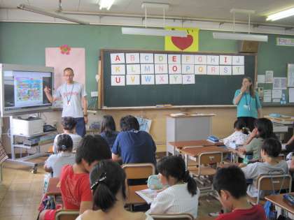 ALTのカーリー先生と一緒に外国語活動「アルファベットで文字選びをしよう」の様子です。