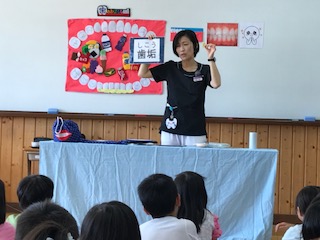 学校歯科医 岩井先生 歯科衛生士 堀江先生に来ていただき歯みがき巡回指導をしていただきました。 1年生は噛むことの大切さやどうしてむし歯になるのかを教えて頂き,小学校で初めてのブラッシング指導を受けました。6年生は歯肉炎や歯周病についても教えて頂いて小学校最後のブラッシング指導を受けました。