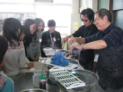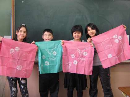 伝統工芸士の方を招いて,かのこしぼり体験をしました。