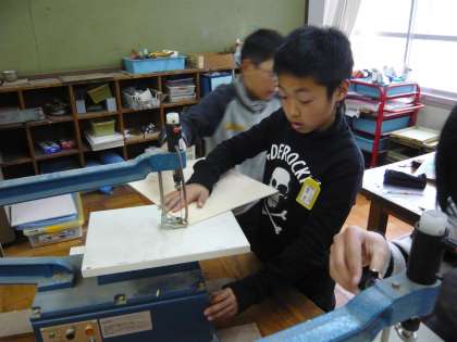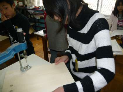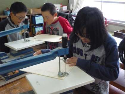 図画工作科では,伝言板作りをしています。今日は初めて電気のこぎりを使って板を切りました。慎重に,切り進み過ぎないように意識して切っていました。