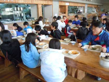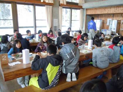 スキー練習を終えてお昼ご飯です。今日の主食はハヤシライスかうどん&山菜ごはんです。疲れも見せずたくさん食べています。