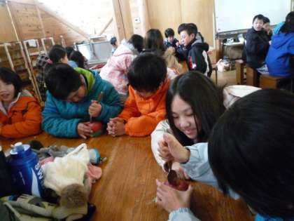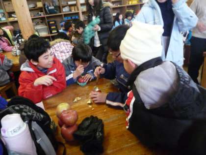 2日目の午後は、焼きりんご作りをしました。りんごの芯を、スプーンを使ってくりぬき、中にバターと砂糖を入れて野外炊事場で焼きました。とってもやわらかくなっていておいしく食べることができました。