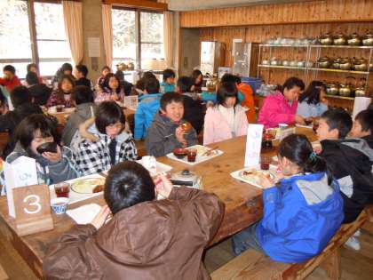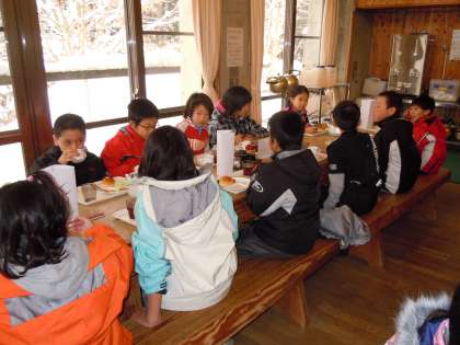 今日の朝ごはんです。疲れていても、朝からしっかり食べることのできる子どもたちです。今日は今から広河原スキー場でのスキー体験です。