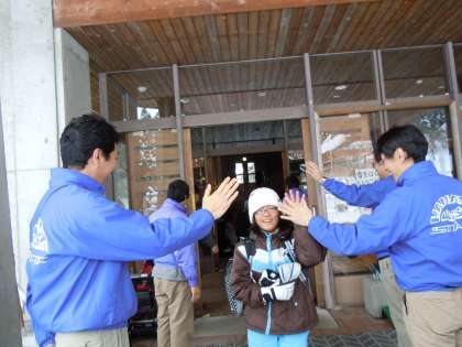 花背山の家を出発します。職員の方々にハイタッチで送り出してもらいました。
